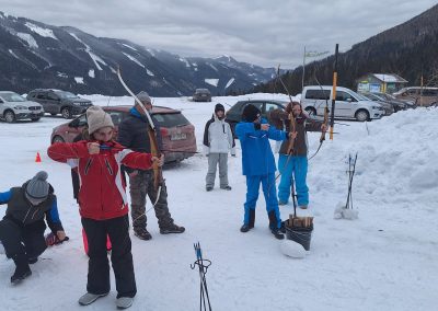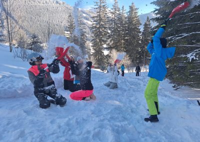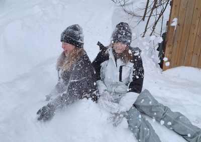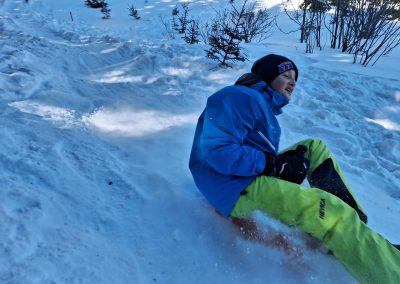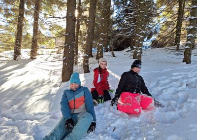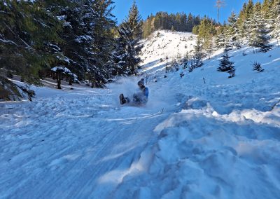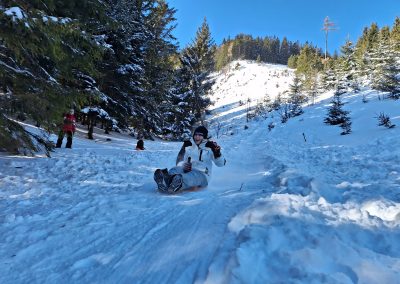 All jene, die zwischenzeitlich eine kurze Pause brauchten oder bereits im Vorfeld einem Alternativprogramm zum Schisport den Vorzug gaben, erlebten ebenfalls jede Menge Action. Das Highlight schlechthin war dabei vermutlich das Bogenschießen, bei dem die SchülerInnen eine spektakulär gute Figur abgaben. Die jeweiligen Ziele wurden dermaßen gut getroffen, dass man aus dem Staunen kaum herauskam. Ein Schüler erhielt postwendend sogar den Beinamen „Sniper“. Fulminant ging es auch beim Bobfahren zu, denn was wäre auch eine Alternativgruppe ohne Bobfahren? Zunächst wurde eifrig mit Schaufeln an einer anspruchsvollen Piste gearbeitet, dann ging mit den pfeilschnellen Zipfelbobs auch schon die Post ab. Bis zum letzten Tag gaben die SchülerInnen ihrer geliebten Bobstrecke den Feinschliff und konnten sich letztlich nur schwer von ihr trennen. Ein echtes „Racer-Girl“ wurde dabei ebenfalls geboren. Ein Highlight für beide Klassen war auch eine ausgiebige Schneeballschlacht. Das Besondere: Die LehrerInnen waren mittendrin statt nur dabei.