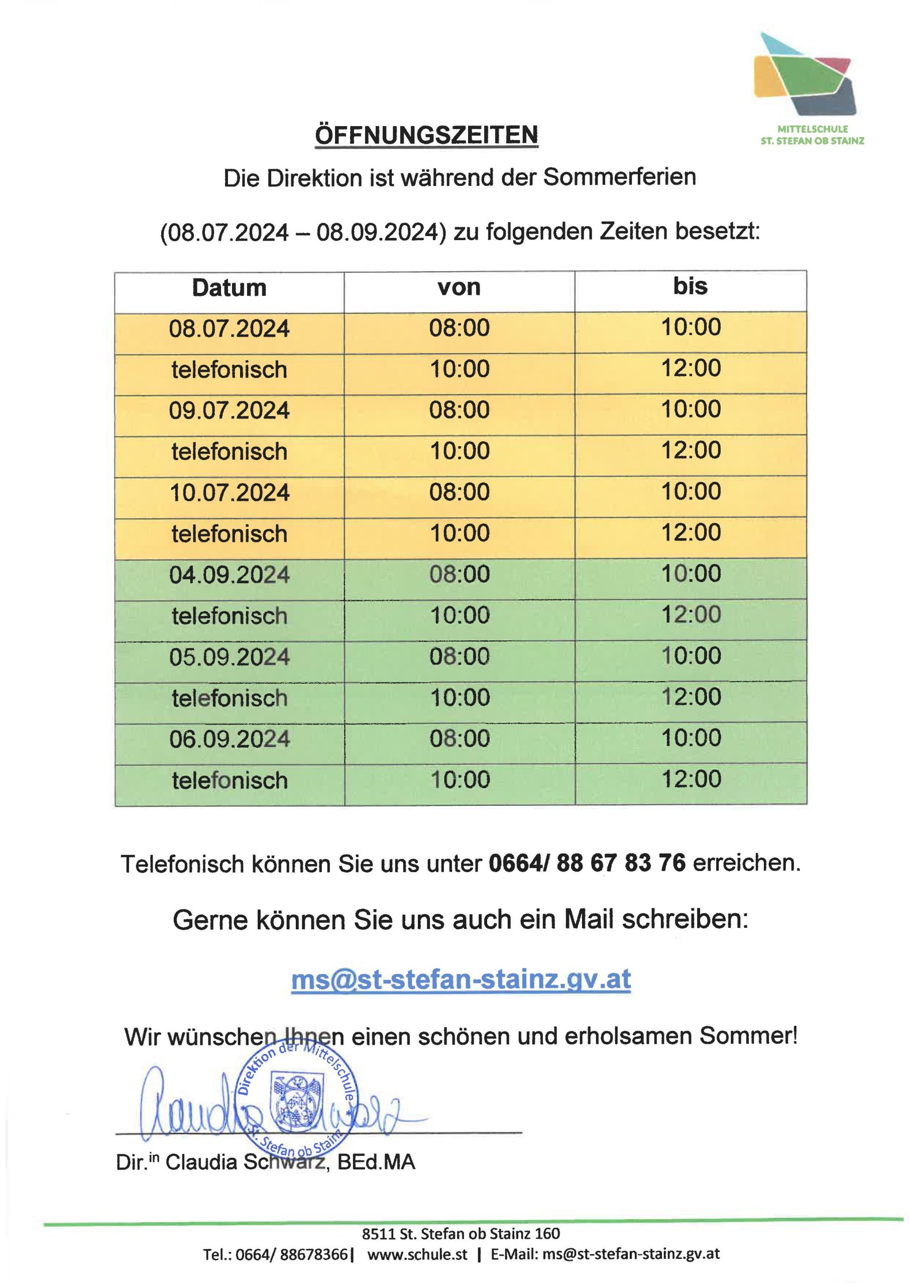 Anwesenheit der Direktion in den Sommerferien