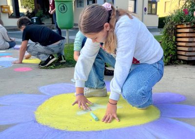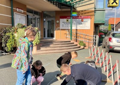 Die Schülerinnen und Schüler hatten viel Spaß beim (Um-)Gestalten des Hauptplatzes. Valentina aus der 1b beantwortete uns einige Fragen über diesen Tag. So erfuhren wir, dass ein großer Fluss bis zur Gemeinde und rundherum unzählige Blumen, Herzen und Tiere gemalt wurden. Viele verschiedene Farben wurden dabei verwendet – weiße, bunte und für den Fluss freilich jede Menge blaue Kreiden. Für spezielle Begeisterung sorgte zudem die Glitzerkreiden, womit Blumen besonders prachtvoll gestaltet werden konnten. Mira und Eva aus der 1a gaben Ähnliches zu Protokoll. Maceo aus der 1b half dabei, einen Wald zu malen. Erwähnenswert: Auch der Bürgermeister leistete einen Beitrag und steuerte eine große Sonnenblume bei.